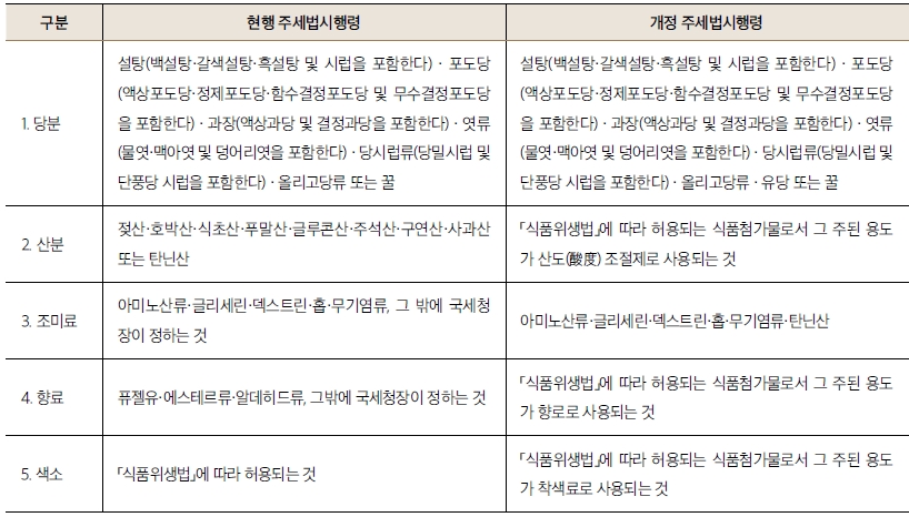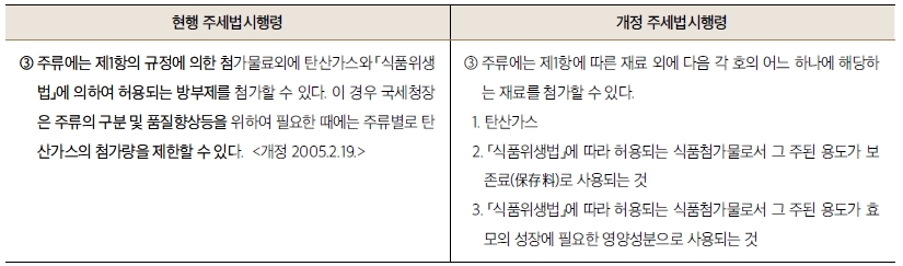 주류 첨가제 중 당분에서 유당이 추가되었으며, 조미료에 탄닌산이 추가되었다. 그 외의 산분, 향료, 색소는 ‘「식품위생법」에 따라 허용되는 식품첨가물’로 범위를 확대하여 기존에 주류에 첨가할 수 있는 첨가물을 「식품위생법」보다 좁게 적시하여 허용한 것에서 「식품위생법」상 허용되는 첨가물로 범위를 확대함으로써 보다 다양한 주류를 생산할 수 있도록 했다.