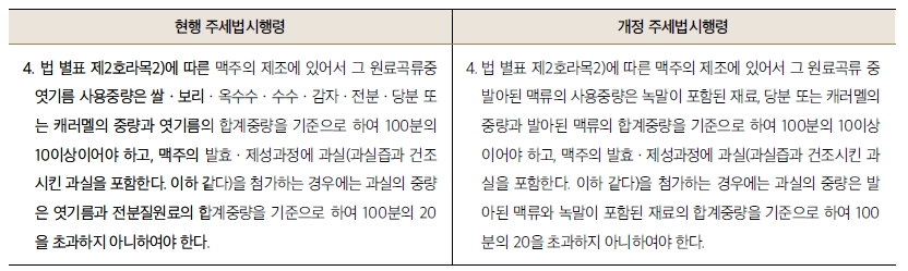 주세법시행령 제3조의 제1항제4호에는 맥주의 주원료를 규정하고 있다. 기존 법률에서는 원료 중 엿기름의 중량이 쌀ㆍ보리ㆍ옥수 수ㆍ수수ㆍ감자ㆍ전분ㆍ당분 또는 캐러멜의 중량과 엿기름의 합계중량을 기준으로 100분의 10 이상이어야 한다고 규정하고 있다. 이번 개정 법률에서는 녹말이 포함된 재료, 당분 또는 캐러멜의 중량과 발아된 맥류의 합계중량을 기준으로 하여 발아된 맥류의 사용 중량이 100분의 10 이상으로 하고 있다. 이는 기존의 쌀ㆍ보리ㆍ옥수수ㆍ수수ㆍ감자ㆍ전분ㆍ당분 등으로 사용할 수 있는 재료를 적시한 것에서 ‘녹말이 포함된 재료’로 범위를 확대했다.