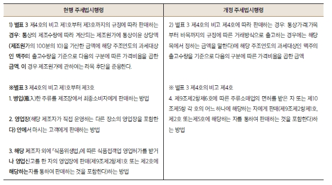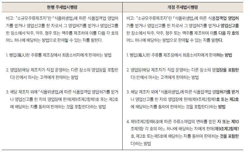 이번 개정 주세법시행령에서는 소규모맥주제조자의 과세표준인하 구간을 확대했으며, 주세법시행령 [별표3]의 제4호 비고의 제4호에서 소매업자에게 판매를 허용하게 된 것과 관련하여 음식점 등의 영업장 판매분과 슈퍼마켓, 백화점, 편의점 등 소매판매분에 대해서 다른 과세표준을 적용하도록 했다. 이번 개정안에서 기존에 일반 소매점에 대한 유통이 막혔던 것을 허용했다는 점에서 긍정적이다. 또한 소규모맥주제조자에 대한 과세표준 경감범위 확대는 소규모양조장의 경쟁력 향상과 사업여건 개선이라는 측면에서 역시 긍정적인 부분이다. 대부분의 소규모 맥주 양조장이 다품종 소량생산 체계를 지향하고 있다는 점과 대기업에 비해서 원재료의 수급 규모가 작고 가격 협상력이 떨어진다는 점, 크래프트 맥주의 원재료 투입 가격이 높다는 점 등을 고려해볼 때 더욱 그렇다.