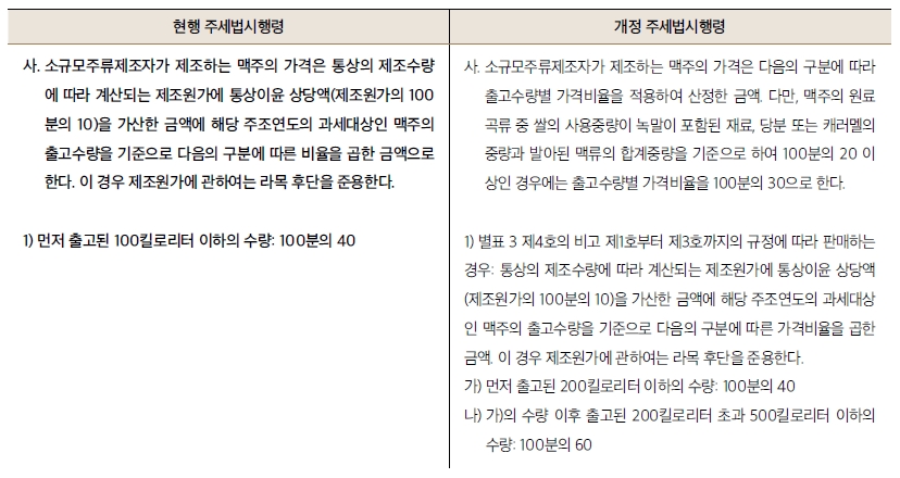 현행 주세법시행령 제20조에서는 소규모주류제조자가 제조하는 맥주의 가격에 대해