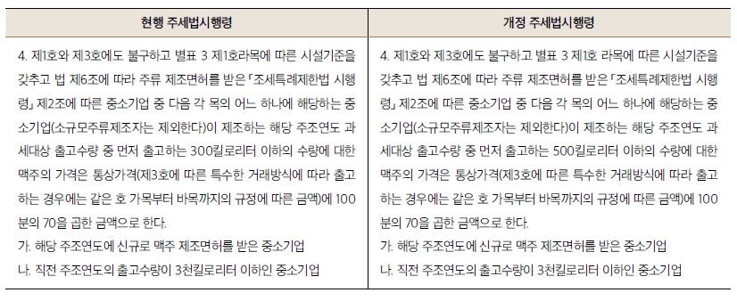 중소기업의 경우에도 과세표준 인하대상 출고수량이 현재 먼저 출고하는 300킬로리터까지 통상가격의 100분의70으로 적용하던 것을 이번 개정시행령에서는 먼저 출고하는 500킬로리터까지로 상향 조정되었다. 적용 대상은 「조세특례제한법 시행령」 제2조(중소기업의 범위)에서 규정하고 있는 중소기업 중 직전 주조연도 출고수량이 3천킬로리터 이하인 기업으로 한정하고 있다. 국내 중소규모 일반면허 양조장이 이 혜택의 대상이다.