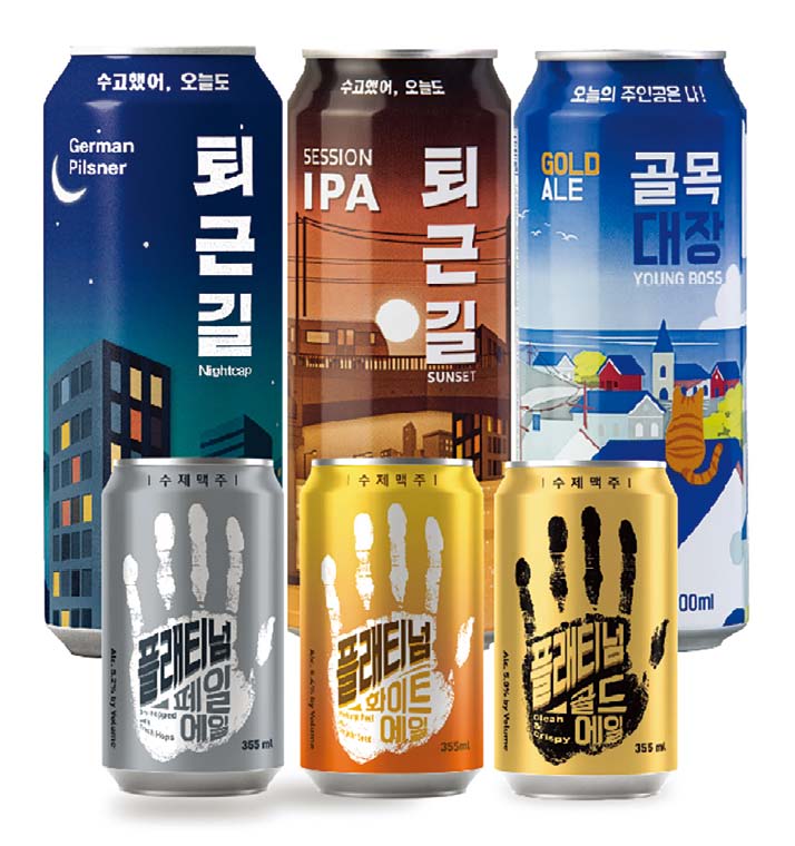 이런 이유로 국내 크래프트 맥주 기업들은 디자인 변신을 꾀하고 있다. 대표적으로 플래티넘은 캔 디자인을 대대적으로 변경하면서 소기의 성과를 거뒀다. 플래티넘은 지난해 11월 CU 편의점과 함께 필스너 스타일의 ‘퇴근길’ 맥주를 런칭했다. 라벨에 밤하늘을 배경으로 불 꺼진 건물을 그려 넣고 ‘수고했어, 오늘도’라는 문구를 새겼다. 퇴근길에 편의점에서 맥주를 구매하는 소비자의 감성을 정확히 파악해 공략한 것이다. 이후 출시한 세션 IPA인 ‘퇴근길2’에서는 해질녘의 도시 풍경에 ‘수고했어, 오늘도’라는 문구를 다시 활용했다.