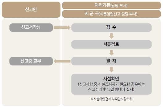 만약 신규가 아닌 기존 일반음식점 업의 영업을 승계하는 경우 영업지위승계 신고서 및 양수자와 양도자와 관련된 서류들이 필요하며, 이 때 소방방화시설완비증명서 제출 대상일 경우 반드시 소방방화시설완비증명서도 양수 받아야 한다. 이를 모두 고려한 영업신고 프로세스는 다음과 같다