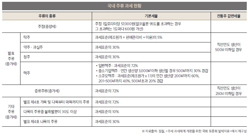 현재 주류산업이 처한 환경에서 주세 개편은 불가피한 측면이 있다. 단적인 예로 위스키의 경우 우리나라에서 제조하지 않고 수입에 의존하고 있다. 현재의 주세 체계로는 경쟁력 있는 가격을 형성할 수 없기 때문이다. 전통주 분야 역시 산업구조가 취약하며, 전반적으로 주류 산업에 속해 있는 기업들이 우리 농산물을 사용하도록 촉진할 수 있는 농업과의 연계 역시 부족한 상황이다.