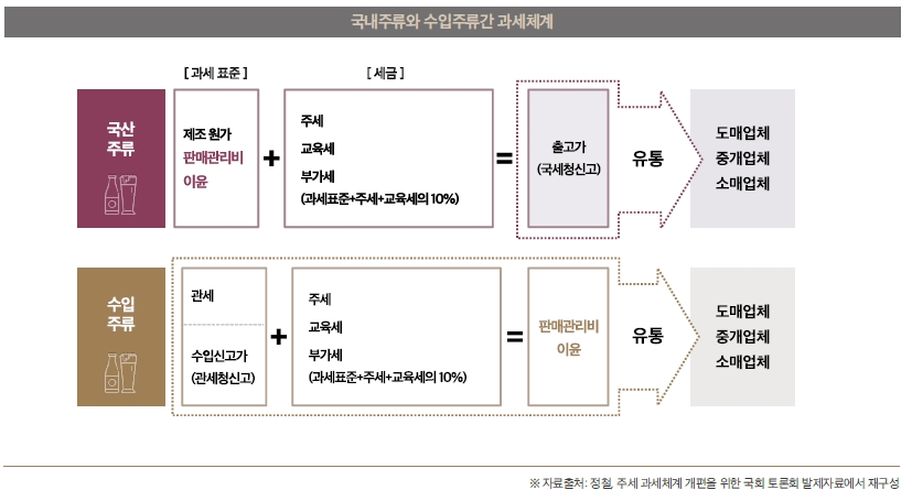 최근 국내 주류와 수입 주류 간 형평성 문제가 불거진 데는 이와 같은 구조의 영향이 크다. 기존에는 수입 주류의 시장 점유율이 낮아 이러한 문제가 이슈화가 되지 않았으나, 수입 주류의 시장점유율이 높아지며 이점에 대한 문제의식이 높아지며 화두로 떠오르게 되었다. 이러한 현상이 발생하는 근본적인 원인은 가격을 기준으로 한 종가세 체계를 주세 부과 방식으로 사용하기 때문이다.