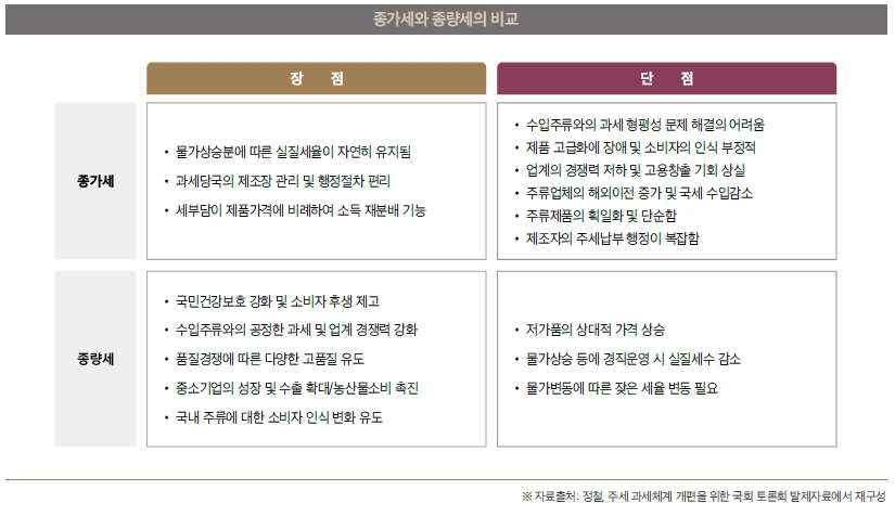 종가세와 종량세의 장단점을 비교하면 다음과 같다. 종가세의 경우 가격을 기준으로 세금이 부과되어 물가 상승에 따른 실질 세율을 유지하기 편리하며 조세징수 관리가 편리하지만, 수입 주류와의 과세 형평성에서 문제가 발생할 수 있다. 또한 다품종 소량 생산, 고급주 생산 등 가격을 상승시킬 수 있는 요인이 세금으로 직결되어 제품 고급화에 부정적 영향을 줄 수 있다. 아울러 대규모 생산 체제를 가질수록 더 유리한 구조로, 고용 창출의 기회 역시 줄어든다.