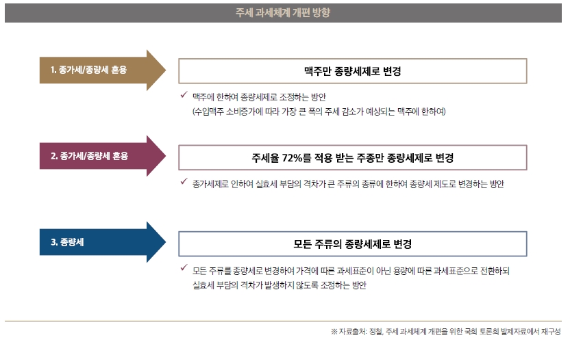 주세 과세체계의 개편 방향은 맥주만 종량세로 변경하거나, 주세율 72%를 적용받는 주종만 종량세로 변경하는 종가세/종량세 혼용 방식과 모든 주류를 종량세로 변경하는 것 등 크게 3가지 안을 고려할 수 있다.