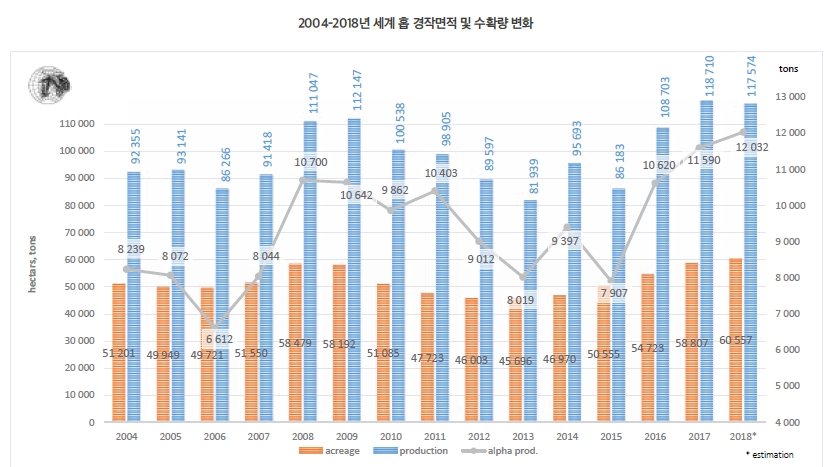 홉은 다년생 덩굴 식물로 첫해부터 수확할 수 있지만, 제대로 된 수확량을 얻기 위해서는 3-4년 정도의 시간이 필요하다. 즉, 기존에재배되고 있던 홉 품종이 다른 종으로 대체되는 경우, 다시 말해 홉 선호의 유행이 달라지는 분기에 경작면적 대비 생산량의 감소가 나타나고 시간이 지나면서 수확량이 점차 회복되는 경향을 보인다.2004년부터 2018년까지 홉 재배 면적의 변화를 살펴보면 2006-2008년까지 상승기, 2008-2013년까지 하강기를 거쳐 다시 홉 재배 면적이 늘어나는 추세다. 이 중 2008년까지의 상승기는 미국발 글로벌 금융위기 이전의 부동산 버블 시기이며, 이후 하강기는 금융위기로 인해 경기 침체가 가시화되던 시기라는 점은 주목할 만하다. 홉 생산량을 살펴보면 2009년부터 점차 감소하는 경향을 보이는데, 특히 주목할 점은 2013년에 전년 대비 경작 면적 감소 폭이 매우 적음에도 불구하고 홉 생산량은 많이 감소했다는 점이다. 이후 2014년 큰 폭의 회복세를 보인 보이며, 이듬해 2015년 다시 큰 폭으로 감소한 후 2016년부터 홉 생산량이 큰 폭으로 증가해 완만한 상승세를 보인다.
