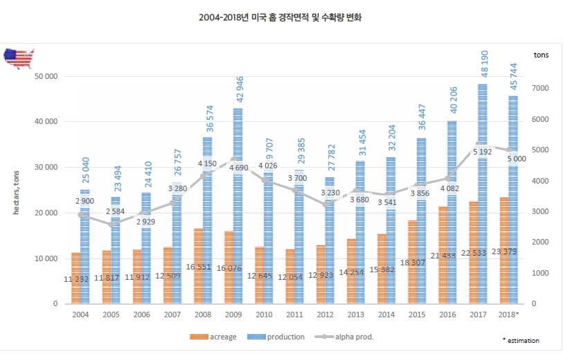 미국에서 홉은 글로벌 금융위기 기간인 2008년부터 2011년까지 경작 면적이 감소하다가 점차 경작 면적을 늘려가고 있다. 2015년 미국의 홉 경작면적은 2008년 수준을 넘어섰으며, 2018년에는 2008년 대비 41%나 증가했다. 그러나 한 가지 주목할 점은 최근 홉 경작면적이 꾸준히 증가했음에도 불구하고, 2018년 홉 생산량은 2008년 대비 약 25% 증가하는 데 그쳤다. 또한, 홉의 알파산을 기준으로 한 Alpha Production을 기준으로 볼 때는 약 20.4% 증가한 수준이다. 2011-2018년 기간동안 경작 면적이 꾸준히 증가한데 반해 홉 생산량의 증가 폭과 Alpha Production의 증가가 둔한 것으로 볼 때 기존보다 알파산 수치가 낮은 홉, 다시 말해 아로마 홉의 재배 면적이 증가하고, 비터링 홉의 재배 면적이 감소했음을 유추할 수 있다. 이와 같은 증거는 미국 홉의 최대 산지인 태평양 북 서부 연안 지역의 홉 특성별 경작면적 비중 변화를 살펴보면 확실하게 알 수 있다.