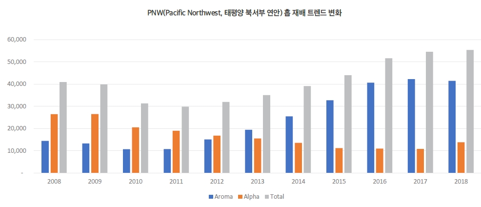 PNW(Pacific Northwest, 태평양 북서부 연안) 지역은 미국과 캐나다의 접경 지역으로 미국 북서부 캐스케이드 산맥 동쪽 지역을 말한다. 이 중 아이다호(Idaho), 오리건(Oregon), 워싱턴(Washington)주는 미국의 최대 홉 산지이기도 하다. 이 지역의 홉 수확량을 보면, 2009년을 기점으로 높은 알파산을 가진 홉들의 수확량이 점차 감소하는 추세를 보이며 2018년 소폭 상승하는 경향을 보였다. 반면 아로마 홉의 경우 2010년부터 꾸준히 수확량이 증가해 2013년 알파 홉보다 많은 수확량을 보였으며, 전체 수확량이 점차 증가하는 가운데 알파 홉 대비 수확량이 크게 앞서는 것으로 나타났다. 이러한 경향은 기존의 알파 홉을 재배하던 지역 일부에 아로마 홉이 재배되기 시작했으며, 새롭게 경작을 시작한 지역에서도 주로 아로마 홉을 재배하고 있음을 보여준다. 이러한 변화의 시작은 2011년으로, 2012년 홉 재배 면적이 증가했음에도 불구하고 미국의 전체 홉생산량과 Alpha Production이 감소한 것에서 찾을 수 있다. 홉이 재배를 시작하자마자 생산량이 극대화되는 것이 아니라 몇 년의 시차가 발생하기 때문이다.
