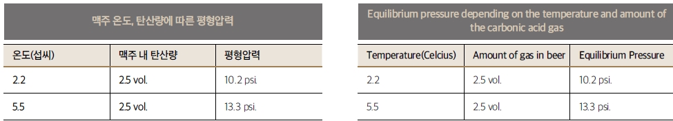 이 원리는 온도와 기체의 용해도와의 관계와 함께 맥주 케그로부 터 맥주를 따르는 탭까지 연결된 호스의 길이와 직경에 따라 다르 게 고려되어야 한다. 첫 번째는 맥주의 온도와 탄산의 용해도이다. 기체가 물에 녹는 양은 온도가 높아질수록 적어지고, 온도가 낮을 수록 많아진다. 즉, 맥주에 녹을 수 있는 탄산의 양은 맥주의 온도 에 따라 다르고 밀폐되어 있는 케그 안의 맥주 역시 온도에 따라 녹아 있는 탄산의 양이 달라진다. 예를 들어 케그에 담겨 있는 맥 주의 온도가 높아지면 맥주에 녹아 있던 탄산가스의 일부는 케그 의 상부로 빠져나와서 통 전체의 압력을 높여 주게 되는 것이다. 이와 같은 원리에 의해서 맥주의 탄산가스양과 상부의 탄산압력 이 같아져서 더 이상 압력이 변하지 않게 되는 포인트를 평형압력 이라고 한다. 맥주의 탄산량이 같더라도 온도가 상승하면 평형압 력이 상승하게 된다.