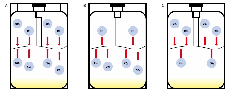 A: 평형압력으로 맞추어 놓은 경우 B: 상부압력이 평형압력보다 낮은 경우-맥주내의 탄산이 상부로 올라간다. C: 상부압력이 평형압력보다 높은 경우-상부의 탄산가스가 맥주로 녹아 들어가게 된다. ※ 맥주 케그 1통을 1-2시간 만에 모두 소진할 수 있다