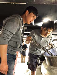 5월 20일, 안동 브루잉 컴퍼니의 양조자들은 일요일임에도 친절히 양조장의 문을 열었고, 대구 스타우트 스맥다운의 우승 맥주인 이인식님의 임페리얼 스타우트 를 양조하기 위해 모인 홈브루어들을 양조장으로 초대했다. 레시피의 창작자이자 최우수작으로 선정된 나승엽님에게는 브루어리에서 하루 통째로 시작부터 끝까지 모든 과정을 함께한 첫 날이었다. 안동 브루잉의 네이선(이인식)님과 양준석님에게도 양조장에서 아주 고도수의 어두운 맥주를 양조하는 경험은 처음이었다. 양조자의 삶이 어떤가 매우 궁금해했던 나승엽님에게는 맥주 한 배치를 만드는 데 들어가는 시간과 노동이 얼마나 되는가 볼 수 있었던, 두 눈이 번쩍 뜨이는 경험이었을 것이다. 곡류의 양이 워낙 많아 양조 과정은 다소 늦어졌고, 대구에서 온 홈브루어들이 밤 10시에 양조장을 떠나야 했을 때 맥주는 아직도 완성되기까지는 몇 시간이 모자란 상태였다. 그 긴 시간에도 불구하고 모든 참여자들에게 이는 아주 특별한 경험이 었다. 도수가 거의 10%에 육박하는 이 임페리얼 스타우트는 다음달 중으로 출시될 예정이며, 어디에서 이 특별한 스타우트를 케그에서 바로 뽑아 드래프트로 마실 수 있는지는 안동 브루어리에 문의하도록 하자.