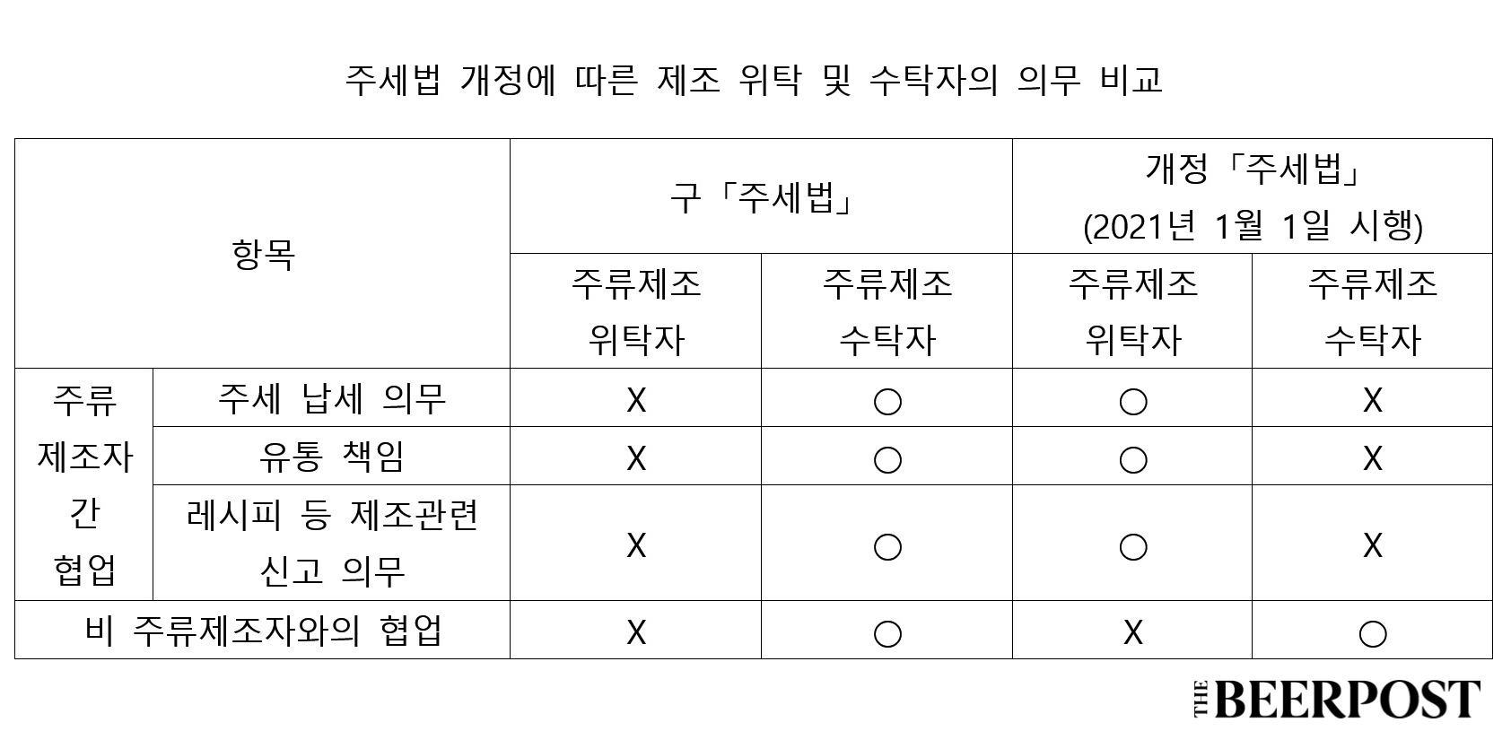 기존 「주세법」에서는 주세의 납세 의무자를 “주류를 제조하여 제조장으로부터 출고(出庫)하는 자”로 규정하고 있어 컬래버레이션 또는 제조 의뢰를 받아 생산된 맥주 등의 주류에 대해 주류를 실제로 제조한 제조사가 레시피를 보유하고, 유통의 주체이면서 제조 관련 신고와 납세의 의무를 부담했다. 반면 신설된 「주류 면허 등에 관한 법률」에서 납세 의무자를 “주류를 제조하여 제조장으로부터 반출하는 자(위탁 제조하는 주류의 경우에는 주류 제조 위탁자를 말한다):”로 규정함으로써 맥주 제조를 위탁한 주류제조 면허자가 보유한 레시피를 수탁자에게 제공하고, 이에 따라 생산된 주류의 유통, 제조 및 납세 관련 신고, 납세의 책임을 지도록 했다.