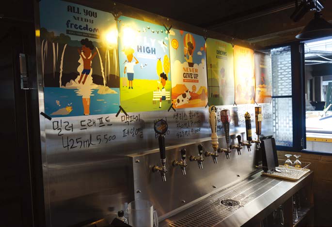 또한 1층에서 선불 결제를 하고 진동 벨이 울리면 받아가는 시스템으로 운영 중이다. 이태원 펍을 중심으로 퍼져 나간 선불 결제를 계몽에서도 활용 중인데 흡사 외국 펍에서 맥주를 마 시는 듯한 이국적인 정취를 더한다. 2017 트렌드 코리아에서 말한 ‘적당한 불편’이 실제로 반 영되고 있는 공간인 셈이다.